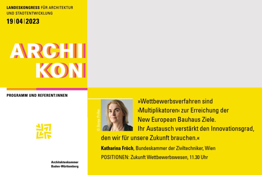 Beim Landeskongress für Architektur und Stadtgestaltung der Baden-Württembergschen Kammer am 19.4.2023 in Stuttgart hielt Katharina Fröch als Vertreterin der Bundeskammer der Ziviltechniker*innen einen Vortrag über die Zukunft des Wettbewerbswesens. Thema war unter anderem wie offene Wettbewerbe als wesentliche Elemente für Transparenz und Innovation wirken, die wir für die Bewältigung der Herausforderungen der Zukunft benötigen.